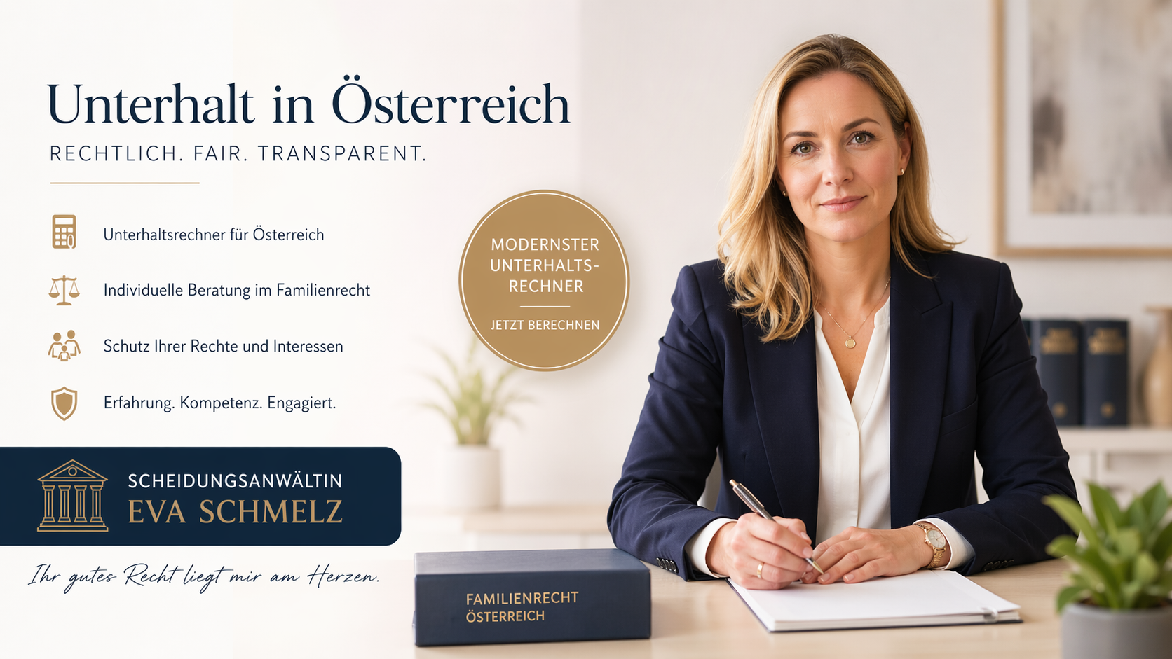 Die Scheidungsanwältin Eva Schmelz verfügt über tiefgehende Erfahrung im österreichischen Familienrecht und kann individuelle Lösungen entwickeln, die weit über Standardberechnungen hinausgehen.